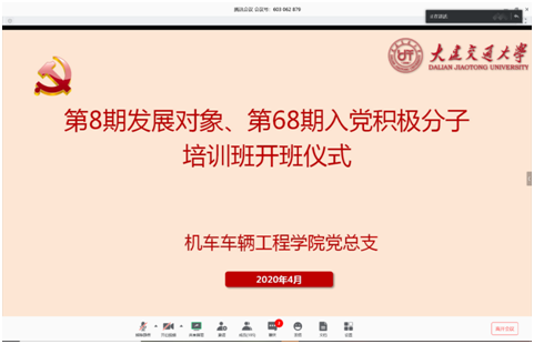 2020年4月1日下午2点,机车车辆工程学院第8期发展对象和第68期入党积极分子培训班开班仪式通过腾讯会议平台顺利召开。开班仪式由院党总支副书记麻会存老师主持,院党总支书记林玉英老师、全体辅导员以及培训学员参加会议。