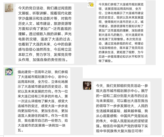 参观结束后,大家对大连的发展充满信心,进一步激发了同志们对新时代的责任感和使命感。大家纷纷表示坚定决心继承和发扬党的优良传统,发挥党员带头作用,以更加自觉的“四个意识”和责任担当,为祖国的蓬勃发展奉献自己的青春力量。