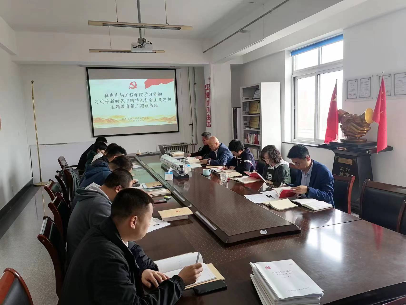 5月15日,机车车辆工程学院在党员活动室举办学习贯彻习近平新时代中国特色社会主义思想主题教育第三期读书班,党总支委员、党支部书记和组织员参加会议,会议由学院党总支书记林玉英主持。