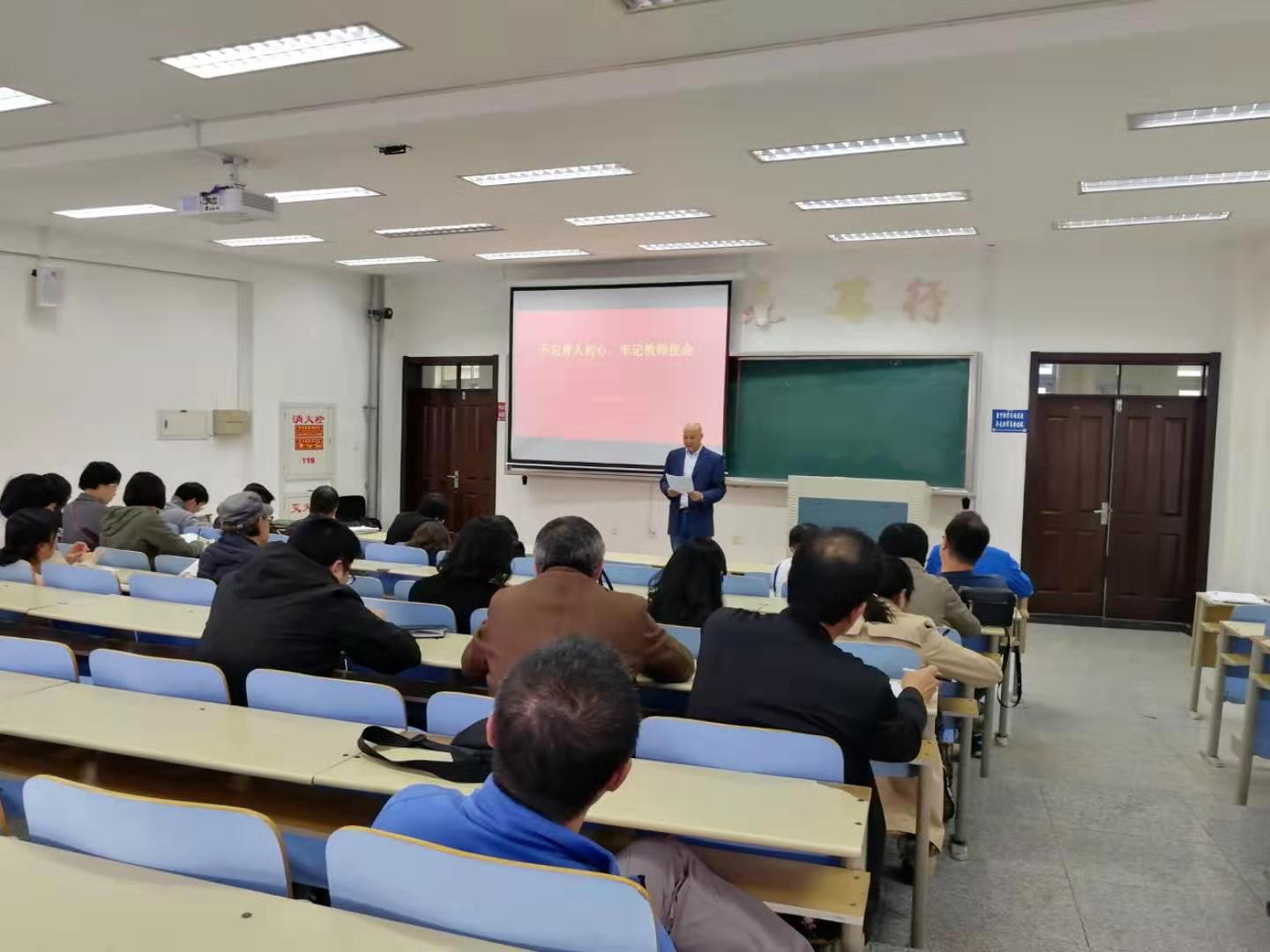 面对时代主题的召唤,围绕为谁培养人、培养什么样的人、怎样培养人这一高校中心任务,费院长提出教师应该发扬中国共产党人不忘初心、继续前进的传统,献身教育,为社会主义教育做出应有的努力。第一,爱岗敬业上好每一节课,做好每件小事,就是对学生最大的关爱。作为教师就是要上好每节课,作为学生工作者就是要以爱育人。第二,刻苦钻研专业理论、提升内涵建设。三、务实中求发展,创新中求突破,奋发进取。我们要发扬创新精神,坚持学科建设改革创新。四、淡薄名利、志存高远,做好社会服务。五、不忘初心、立德树人,做好学生成长的引路人。教师要坚守好自己的初心,承担好自己的使命,育人育德。