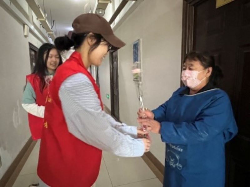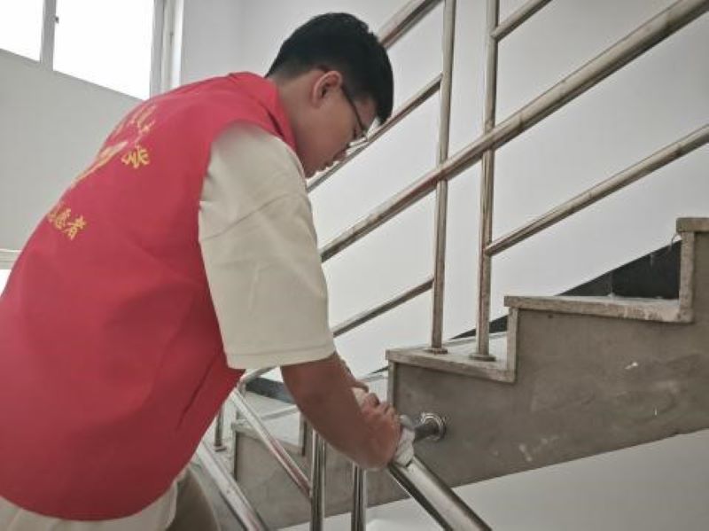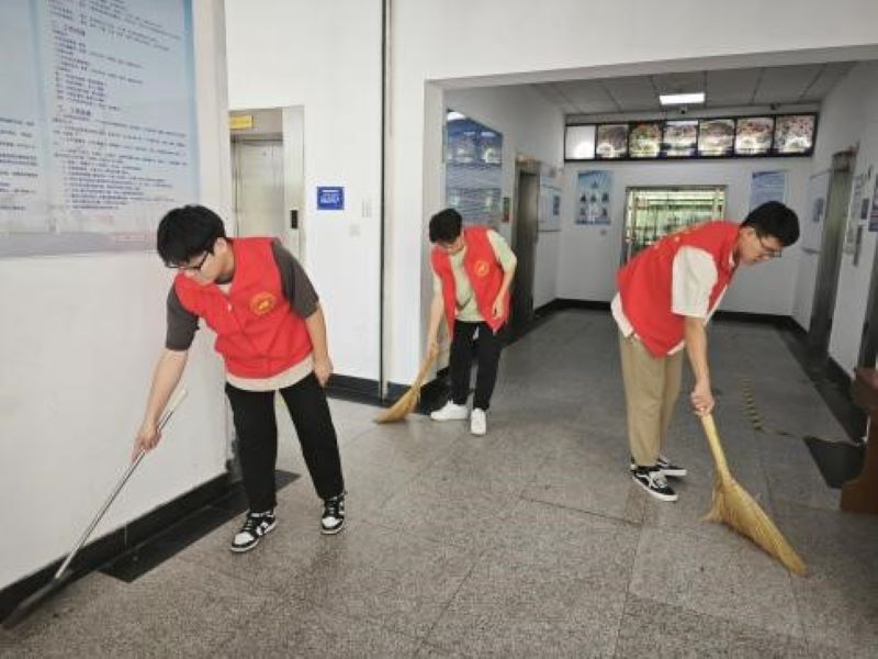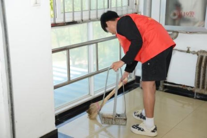 清晨,阳光透过窗户洒进楼道,将地面照得闪闪发光。志愿者们陆续来到楼道,准备与住宿管阿姨一同开展卫生打扫活动。阿姨们脸上洋溢着笑容,仿佛看到了自己的孩子们一样。