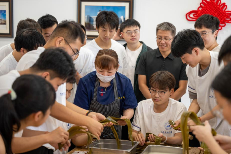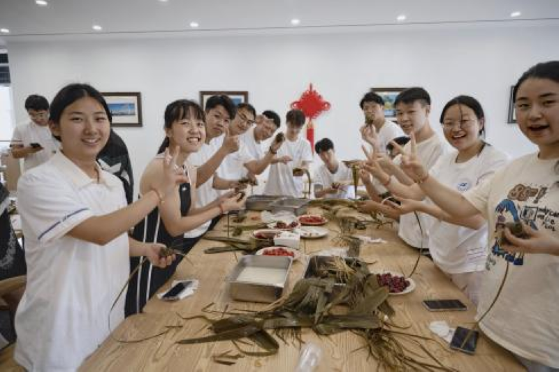随后,同学们拿着五彩丝线缠绕、打结、编织,一气呵成,编出了各种形状和风格的漂亮五色丝线装饰,增添节日的氛围和粽子的美感。在这个过程中,大家不仅学会了如何包粽子栓丝线,也尝到了饱含师生回忆的悠悠粽香,感受到了浓浓的师生情谊。
