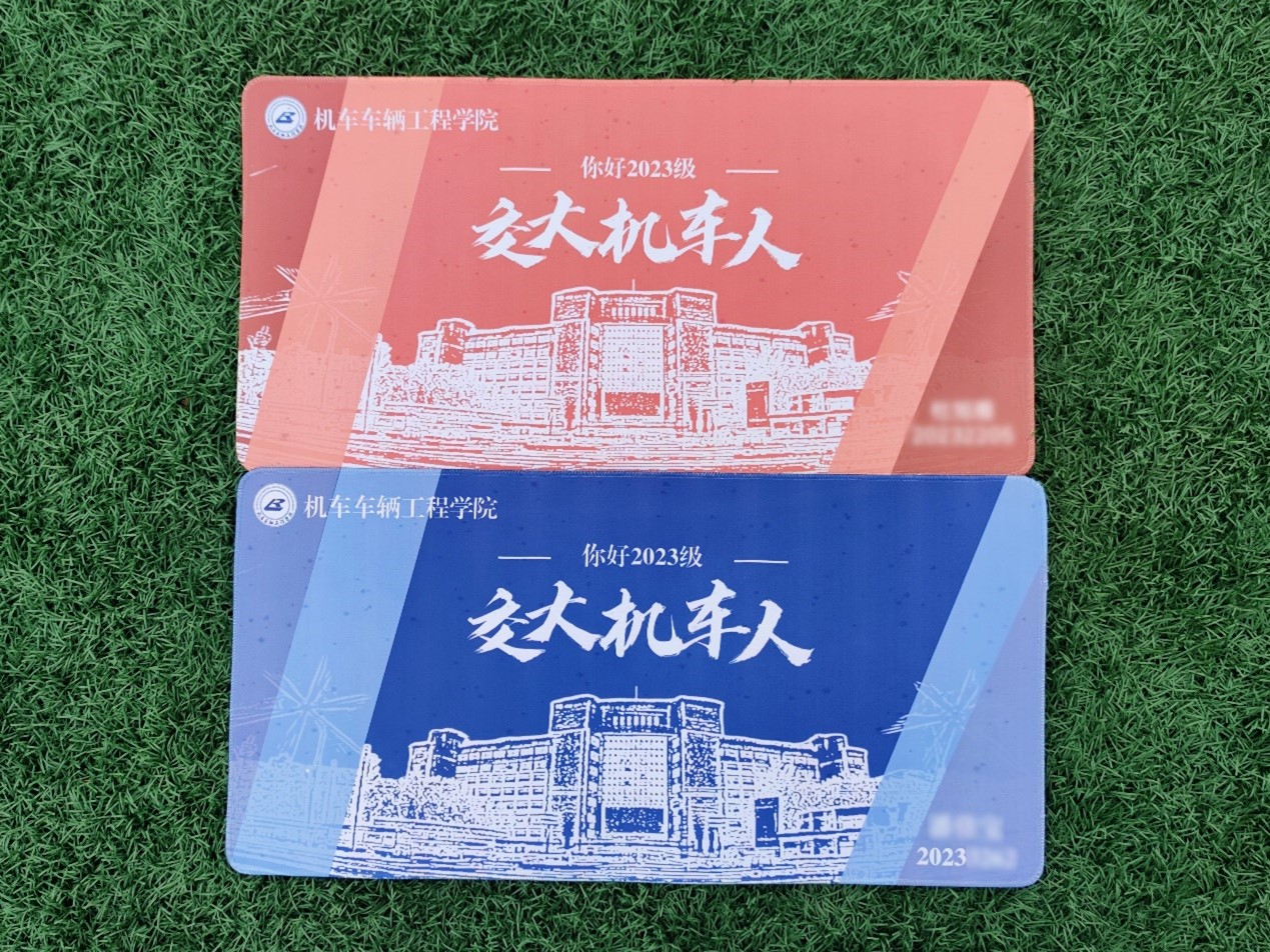 键盘垫设计元素:①院徽;②交大沙河口校区教学主楼;③个性化姓名学号(男生为蓝色,女生为橘色)
