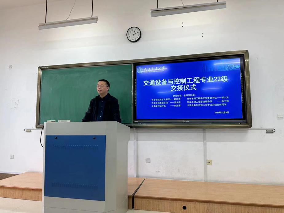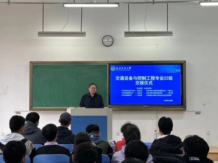 分别于沙河口校区、旅顺口校区召开交通设备与控制工程专业学生交接会,本次会议由学院党委副书记郭大为主持,中车学院党总支书记赵红雨,中车学院团委书记吴永鑫,相关辅导员和全体2022、2021、2020级设备专业学生参加会议。