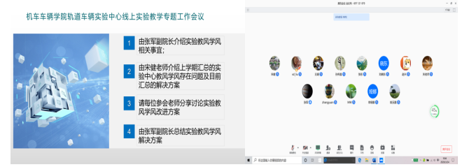 3月24日上午9点,机车学院副院长张军主持召开了学院2020年春季学期实践教学线上研讨会。会议以提高实践教学教风与学风问题进行深入的专题讨论,以便疫情过后学生返校时实践教学的顺利开展,尽量降低疫情对实践教学的影响,以及切实提升实验教学教风学风。实验中心主任刘晓东、副主任宋健、相关承担实验教学教师等共13人参加会议。
