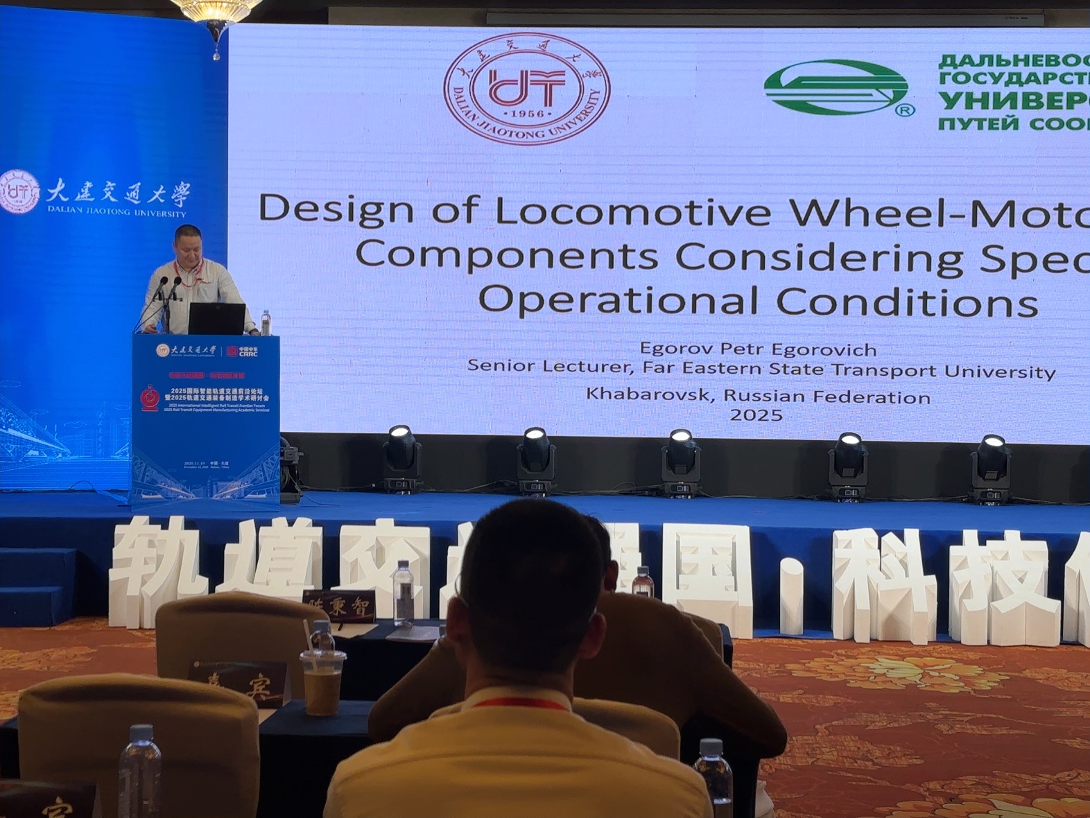 俄罗斯远东国立交通大学的专家团队带来了国际视角。叶戈罗夫·彼得·叶戈罗维奇高级讲师就机车轮对驱动装置在复杂运用条件下的设计方法作了报告,波塔波夫·安东·安德烈耶维奇主任工程师则围绕机车可靠性评估标准展开分析,展现了中俄在轨道交通技术领域的深度交流。